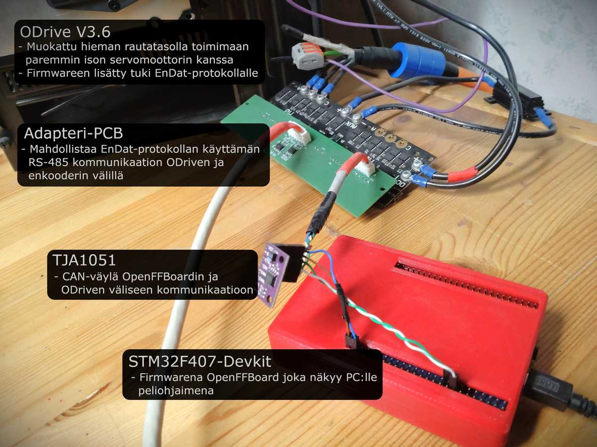Projektin alkuun pääsyä haastoi moottorin enkooderin suljettu EnDat-protokolla. Avoimen lähdekoodin projektit eivät sitä suoraan tukeneet ja protokollan yksityiskohdista vapaasti saatavilla olevaa tietoa oli niukasti. Sinnikäs selvitystyö tuotti kuitenkin tulosta niin, että Juho sai moottorin toimimaan yhdessä ODrive-moottoriohjaimen kanssa. Käytännössä tämä vaati sekä rauta- että softa-tason muutoksia. Moottoriohjaimen ja enkooderin väliin tuli itse piirretty adapteri-pcb mahdollistamaan protokollan vaatiman RS-485 kommunikaation. Ohjaimen firmware puolestaan sai tarvittavan tuen EnDat-protokollalle. Erityisen mielenkiintoiseksi hän kokee juuri elektroniikan yhdistämisen.